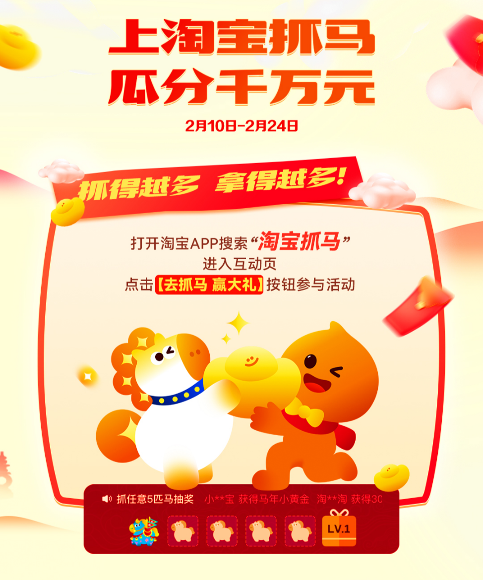 马年新春将至,淘宝正式推出春节特别互动活动——“上淘宝抓马 淘个好彩头”。2月10日至2月24日,用户打开淘宝APP搜索“淘宝抓马”或“淘个好彩头”,即可参与趣味互动,赢取红包、黄金大奖及品牌好礼。