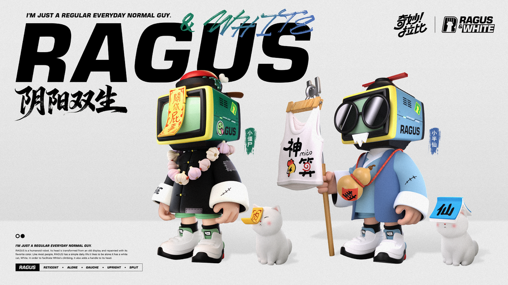 在外观与互动设定上,“阴阳双生”遵循设计师对雷格斯(RAGUS & WHITE)本身的理解——过家家,即雷格斯(RAGUS & WHITE)本质是个孩子,他会用身边随手可得的物品进行角色扮演,既荒诞又充满想象力。其中,“小半仙・阳”是爱吹牛、话多却不靠谱的“算命先生”,进入测算环节却会瞬间切换为专业有条理的状态,造型上融入倒扣碗、筷子簪、糖果葫芦、晾衣架招牌等元素,潮玩语言与角色扮演感兼备;“小僵尸・阴”则是外表凶悍、实则胆小怕黑的“僵尸”,紧张时会结巴,喜欢鬼故事却总把恐惧包装成逞强,黑马褂、平底锅改造的帽子、大蒜项链等细节设计极具记忆点,额头黄符上“关你屁事”的字样更是增添一份趣味。