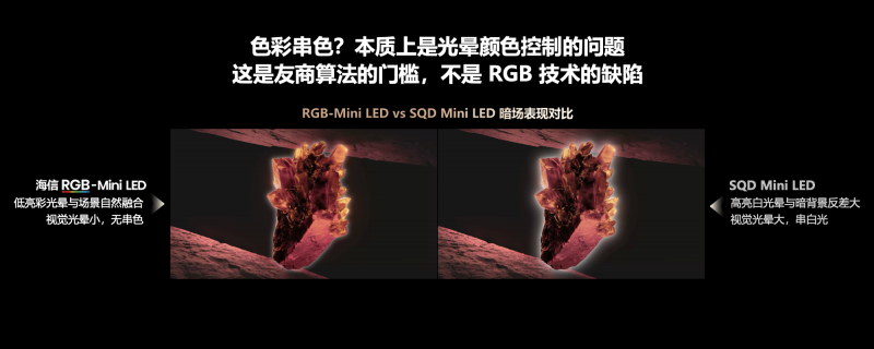 而被视为QD-Mini LED升级版的SQD-Mini LED,则沿用了单色背光+量子点的传统方案,依赖蓝光激发量子点实现“被动增色”的高色域,在转换过程中易产生色偏、色彩衰减等问题,且无法独立控色,暗场画质易出现“串白光”现象,高亮场景中又会出现色彩冲淡、偏色等,无法同时兼顾画面的纯净度与立体层次感。因此与RGB-Mini LED相比,SQD-Mini LED的整体画质表现并不理想。