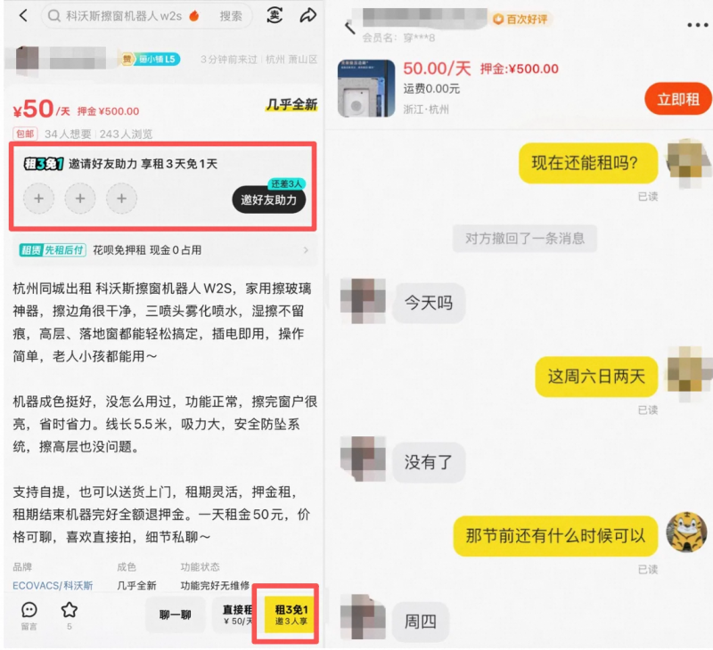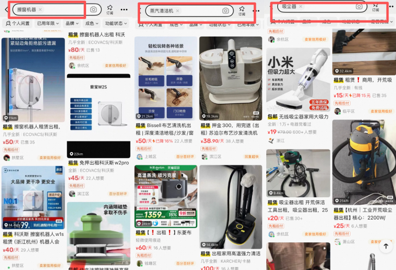 闲鱼租赁业务负责人介绍,进入腊月以来,平台内相关品类搜索量与咨询量同步攀升,尤其在年轻用户群体中,“擦窗机器人怎么租”“蒸汽清洁机好用吗”等成为高频问题。团队分析发现,当前闲鱼家清类设备的租赁单日价格中位数仅在50元左右。几十块钱就能“用一阵”,既不用花大价钱买清洁家电,也不用为闲置后的落灰发愁。