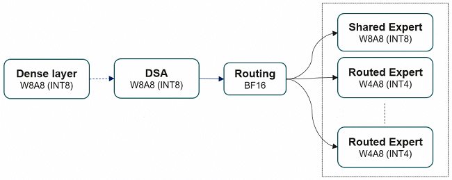 1、按模块区分量化比特与算法:例如Attention与MLP主体用W8A8,MoE专家用W4A8;gate等量化敏感层可按需回退,避免过大精度损失。
