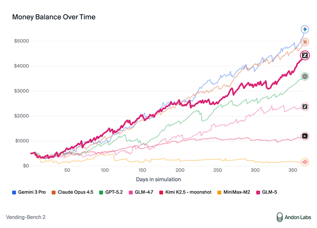 在衡量模型经营能力的Vending Bench 2中,GLM-5获得开源模型中的最佳表现。Vending Bench 2要求模型在一年期内经营一个模拟的自动售货机业务,GLM-5最终账户余额达到4432美元,经营表现接近Claude Opus 4.5,展现了出色的长期规划和资源管理能力。