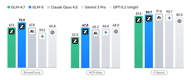 GLM-5在多个Agent测评基准中取得开源第一,在BrowseComp(联网检索与信息理解)、MCP-Atlas(工具调用和多步骤任务执行)和τ²-Bench(复杂多工具场景下的规划和执行)均取得最优表现。