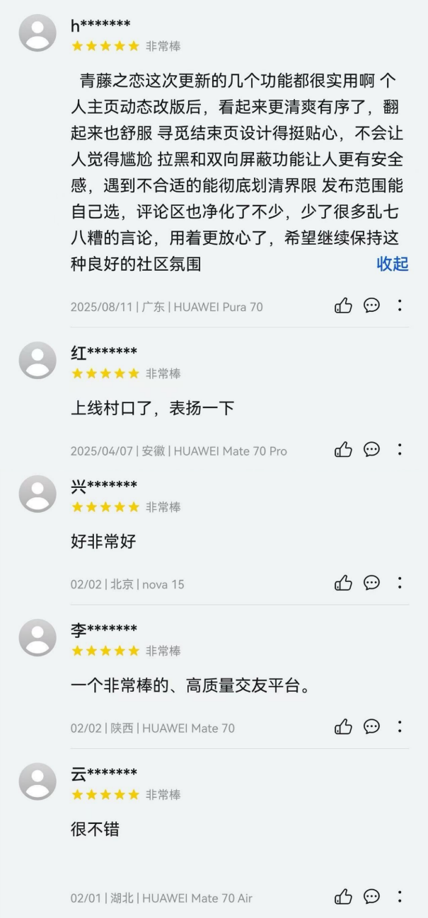 目前,鸿蒙版青藤之恋核心功能齐备,寻觅、喜欢、消息、村口、我的五大板块全面上线,无论是高效匹配、轻松互动,还是社区分享、关系推进,都能顺畅完成。头像、身份、学历、婚况四重认证,为每一次相遇提供稳稳的安全感。从相识到相知,全程为你把关,难怪华为应用市场都被好评刷屏了。