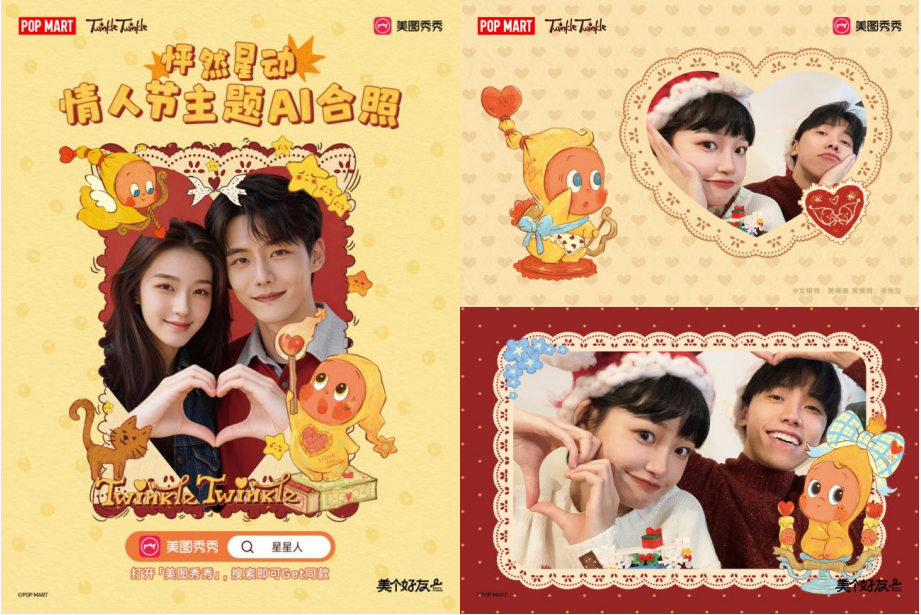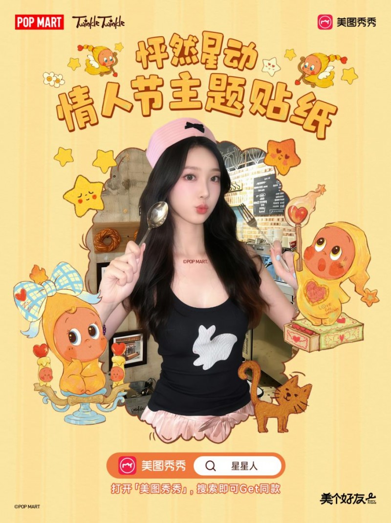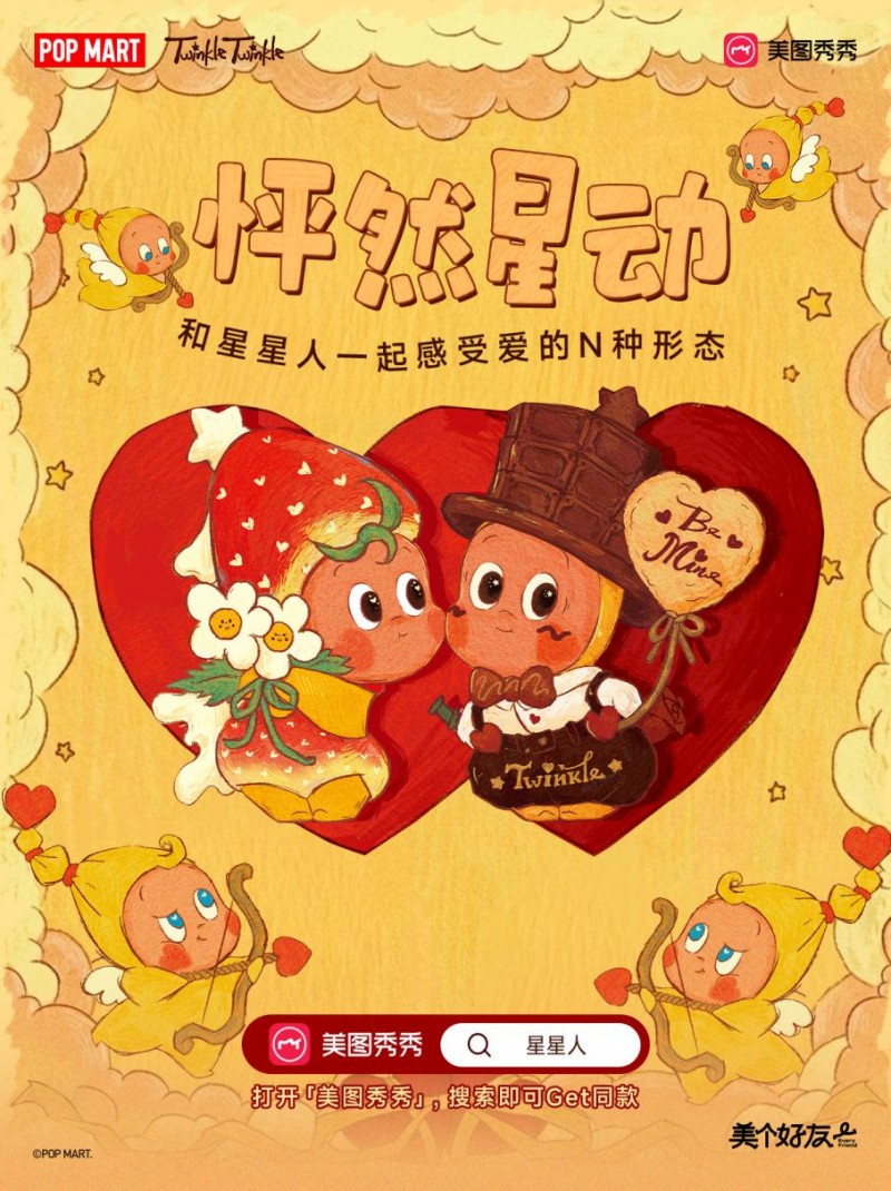 情人节将至,各大品牌也推出情人节相关活动,其中,美图秀秀携手泡泡玛特旗下超人气IP“星星人”推出的情人节系列素材备受关注。