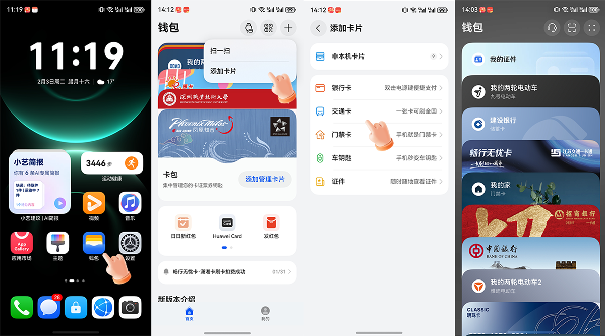 爸妈现在用的,都是我去年送的华为手机。这次我花了几分钟,先升级到鸿蒙6,再帮他们把常用的卡和证件都添加进华为钱包。只需要在手机桌面找到钱包App,点右上角"+",选"添加卡片"就可以,操作便捷又简单。