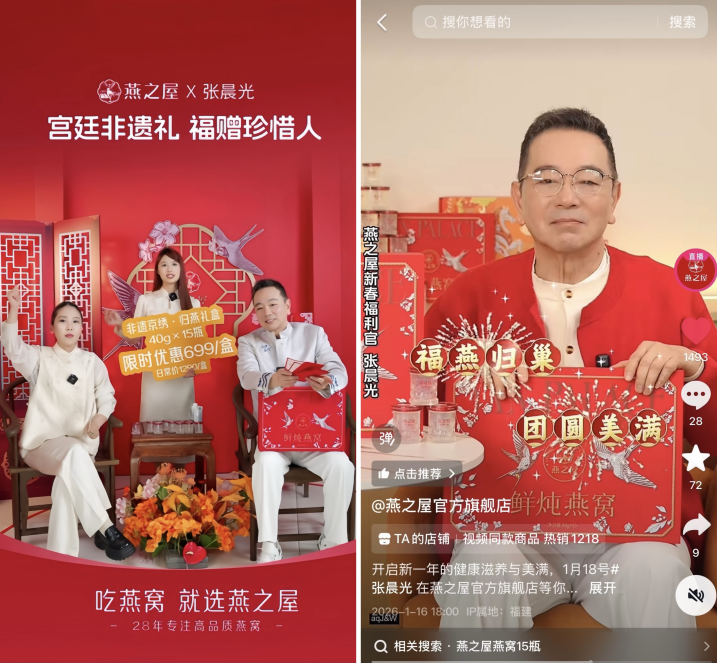 展开来说,燕之屋的高端款产品,联合国家级京绣传承人定制了限定包装,做深了产品的稀缺性和美感;并且搭配“爷圈顶流”明星的站台、贺岁短剧植入等形式,传递高端品质,鼓励消费者用高档年货送礼加深与亲人的联结。