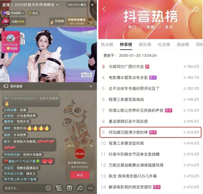 不仅如此,DR.WU达尔肤还带产品参与到“2026抖音华彩传承晚会”。一面用稀缺性内容放大商家魅力,另一面借晚会的高关注、明星何泓姗穿汉服现场直播带货的种草力,引发产品的拔草转化。