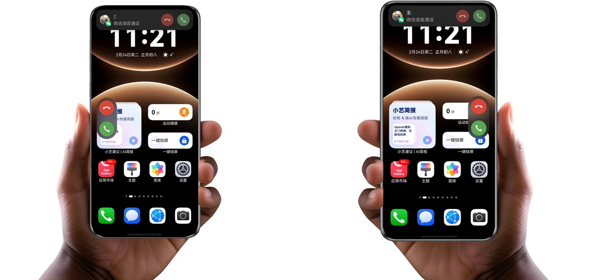 • 赶路接电话不狼狈:不管你是单手拎着热咖啡赶路的打工人,还是一手拿外卖/快递的骑手,或是拖着行李匆匆进站的旅客——以前来电只能慌忙换手。而现在,不管是系统电话,还是鸿蒙版微信、畅连、钉钉、飞书等语音来电,横幅自动滑到侧边跟手位置,接听/拒接键就在大拇指边上,来电一点不狼狈!