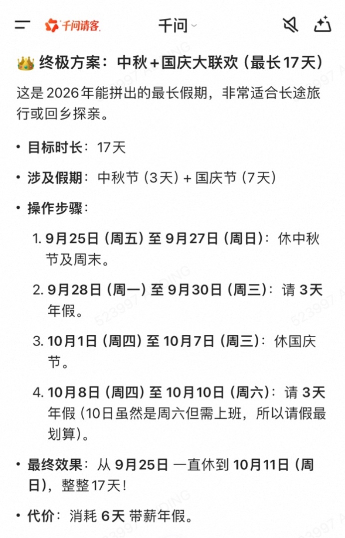 对此,千问官方表示,虽然满足了网友们的请假条需求,但还是建议朋友们直面人终究还是要上班的现实。如果实在不想上班,还可以尝试将今年中秋、国庆假期和年假拼成17天超长假期,实现从9月25日到10月11日连休17天的“拼好假”。