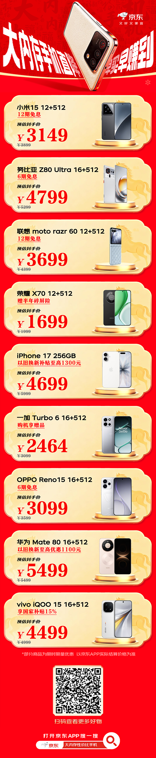 其中,小米15 12GB+512GB预估到手价3149元,享12期免息。努比亚Z80 Ultra 16GB+512GB预估到手价4799元,享6期免息。联想moto razr 60 12GB+512GB预估到手价3699元,享12期免息。荣耀X70 12GB+512GB预估到手价1699元,赠半年碎屏险。iPhone 17 256GB预估到手价4699元,享以旧换新至高补贴1300元。一加 Turbo 6 16GB+512GB预估到手价2464元,购机享赠品。OPPO Reno15 16GB+512GB预估到手价3099元,享6期免息。华为Mate 80 16GB+512GB预估到手价5499元,享以旧换新至高优惠1100元。iQOO 15 16GB+512GB预估到手价4499元。