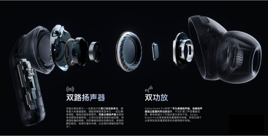 在硬件配置方面,三星Galaxy Buds4系列的两款机型还在扬声器配置和功放设计方面进一步实现强化。其中,采用开放式设计的三星Galaxy Buds4搭载11mm的动态宽频扬声系统,带来动听均衡的音效;而三星Galaxy Buds4 Pro则搭载了升级的增强型双路扬声器,配有振膜面积更大的宽幅极窄边低音单元和高精度的平面高音单元,并拥有独立配置的双功放设计,呈现出从澎湃低音至通透高音的全频段聆听体验。