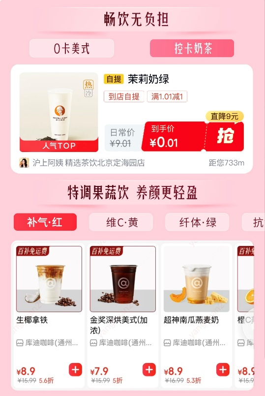 在服务上,京东不仅提供“一杯即送”外卖送到家服务,也提供“自提更省”的体验,购买双杯饮品到店自提还可再减一元,让闺蜜小聚的快乐加倍。