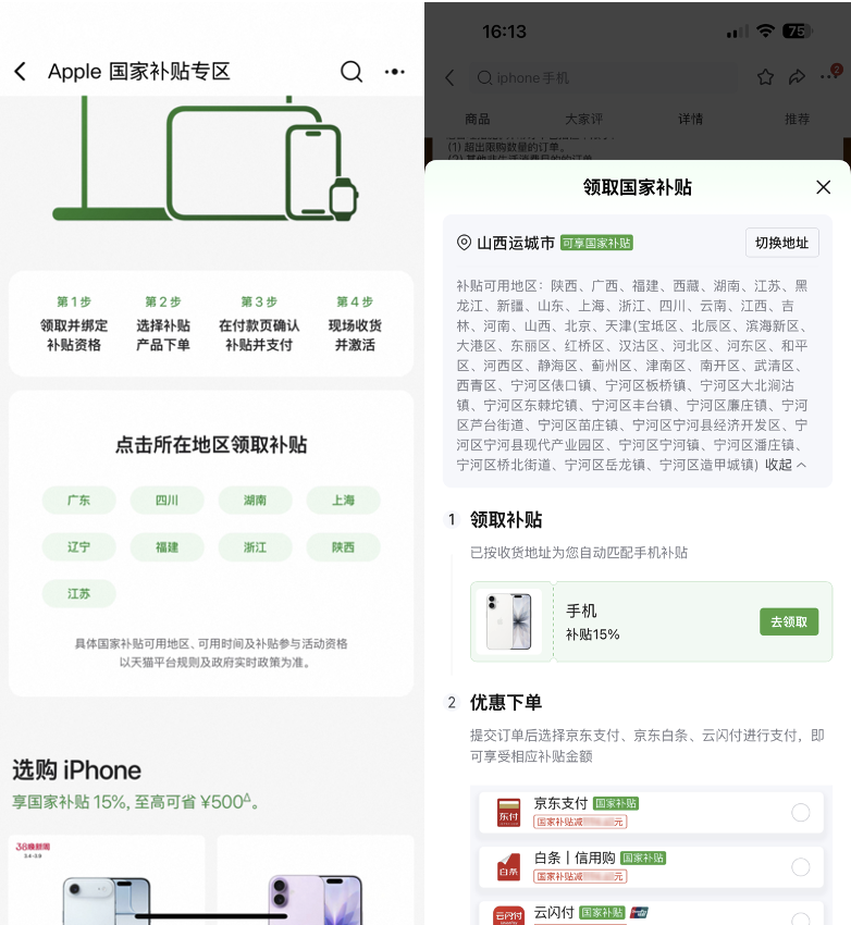 首先是国补、教育优惠方面,各大平台优惠的力度都是一样的,稍有区别的仅有上线城市了。目前天猫国补上线的城市只有广东、四川、湖南、上海、辽宁、福建、浙江、陕西、江苏9个省市,而京东上线了陕西、广西、福建、西藏、湖南、江苏、黑龙江、新疆、山东、上海、浙江、四川、云南、江西、吉林、河南、山西、北京、天津、安徽等20个省市,比天猫多11个地区。
