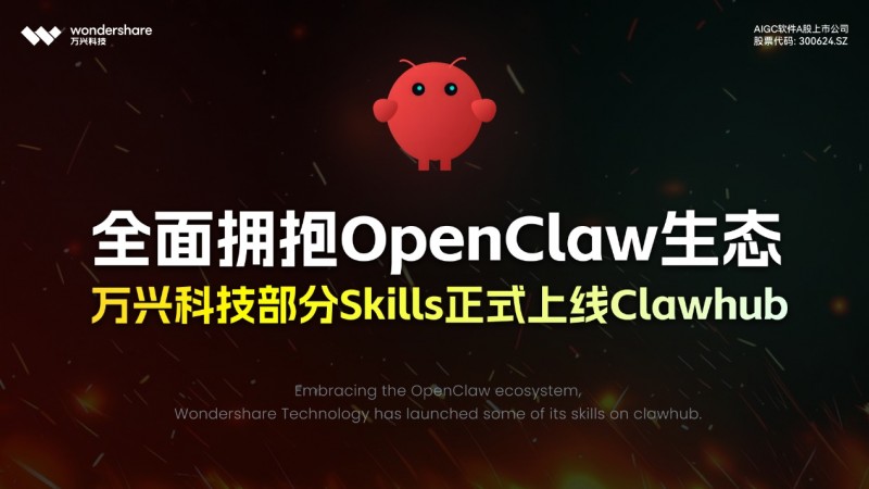 3月8日,AIGC软件A股上市公司万兴科技(300624.SZ)加码AI Agent布局,率先全面拥抱火爆全球的OpenClaw生态,对外宣布旗下面向开发者和企业用户的万兴天幕创作引擎近十项原子能力Skills已在海外OpenClaw市场平台ClawHub正式上线。用户登陆即可调用相关原子能力,一键解锁从创意到成品的全链路音视频创作,并可借此打造自身专属AI Agent。