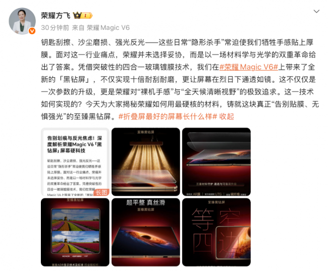 “我们是在解决用户最真实的焦虑。”荣耀高管方飞表示,黑钻屏的诞生并非一蹴而就,而是为了实现“折叠屏也能放心用”的纯粹体验。这种对底层技术的死磕,让Magic V6被不少业内人士视为“折叠屏目前能做到最好的样子”。