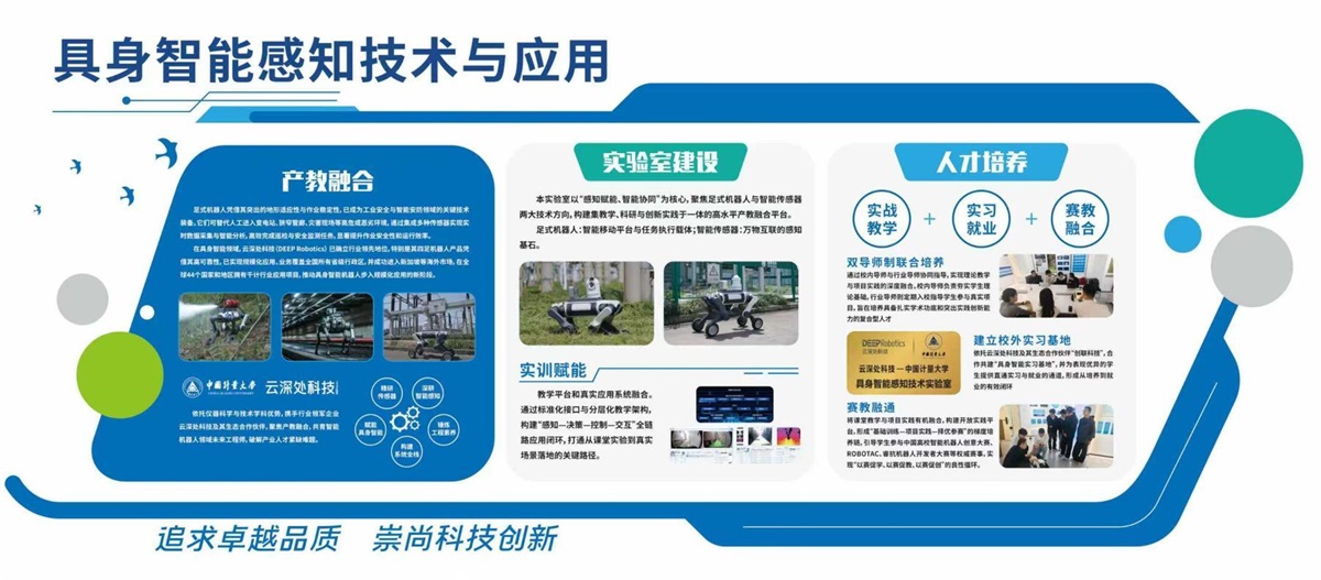 在中国计量大学,云深处科技支持的“具身智能感知技术实验室”成为智能感知工程专业的教学创新平台。学生在模拟变电站等场景中调试多传感器融合算法、优化自主导航策略。通过“双导师制”与“赛教融合”,实验室有效打通课堂理论与产业应用路径,让学生在真实问题中完成从知识学习到工程创新的跃迁。
