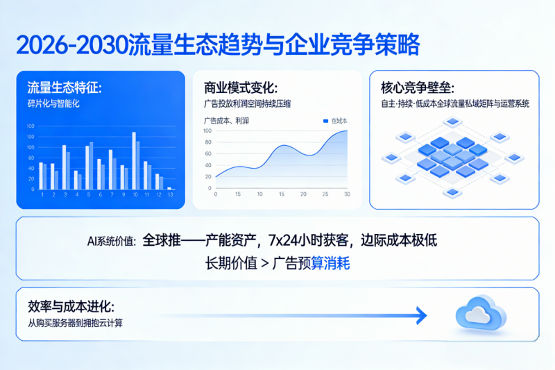 未来:投资“系统”,而非“消耗”广告 展望2026-2030年,流量生态将更加碎片化与智能化。单纯依赖广告投放的商业模式,其利润空间将被持续压缩。企业真正的竞争壁垒,将在于是否拥有一套能够自主、持续、低成本获取全球流量的“私域矩阵”与运营系统。投资像全球推这样的AI系统,本质是投资一项“产能资产”——它一旦部署,便能以极低的边际成本,7x24小时地为你工作、获客,其长期价值远高于不断消耗的广告预算。这如同当年企业从购买服务器转向拥抱云计算,是效率与成本结构的根本性进化。