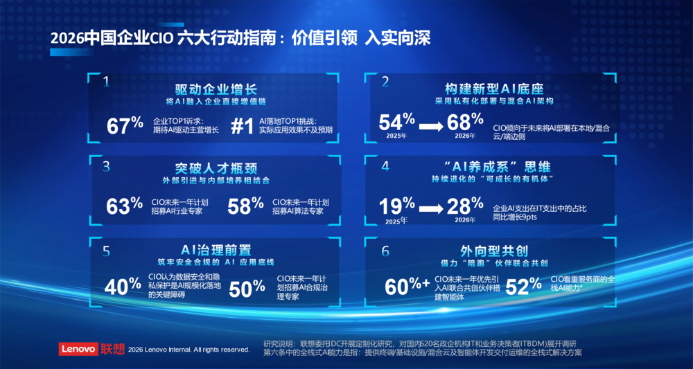 这一背景下,联想发布了《企业CIO行动指南(2026)》,阿木结合《指南》指出企业落地AI的六大行动:一是AI必须与企业增长挂钩;二是树立“AI养成系”思维,使AI成为可成长的业务伙伴;三是强化人才体系建设,63%的CIO计划未来招募AI专家;四是算力布局理性化,68%的企业CIO倾向私有化或混合AI架构;五是主动构建AI治理体系;六是推动AI联合共创,超过六成CIO将优先引入合作伙伴。阿木表示:“越来越多企业将AI从工具层推向销售、供应链、运营、服务等增值场景,AI正在直接参与价值创造。”