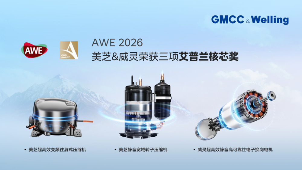 【中国·上海 】2026年3月15日,备受关注的家电与消费电子行业年度最高荣誉——AWE 2026“艾普兰奖核芯奖”在上海圆满落下帷幕。全球领先的暖通家电核心部件供应商GMCC美芝、Welling威灵凭借美芝静音宽域转子压缩机、美芝超高效变频往复式压缩机,以及威灵超高效静音高可靠性电子换向电机,成功斩获三项大奖。值得一提的是,这已经是美芝、威灵连续十余载荣获这一荣誉,美芝、威灵在暖通家电领域的技术、研发、制造能力再次得到了行业认可。