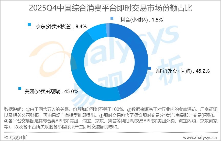 3月14日,第三方研究机构易观分析发布即时零售市场报告显示,2025年第四季度淘宝闪购即时交易市场份额为45.2%,美团为45.0%,两者份额差距仅 0.2个百分点,即时零售市场呈现多平台竞争态势;京东即时交易市场份额为8.4%,位列第三。