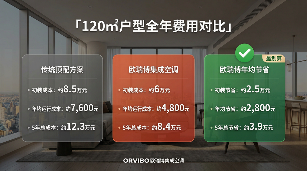 这种效率的提升,直接转化为用户实实在在的经济节省。根据欧瑞博实验室的测算,以一个120㎡的三室两厅户型为例,采用“日系中央空调+德系壁挂炉地暖+燃气热水器”的传统顶配方案,年均运行费用约为7,600元。而采用欧瑞博集成空调方案,年均运行费用可降至约4,800元,每年节省超过2,800元 。