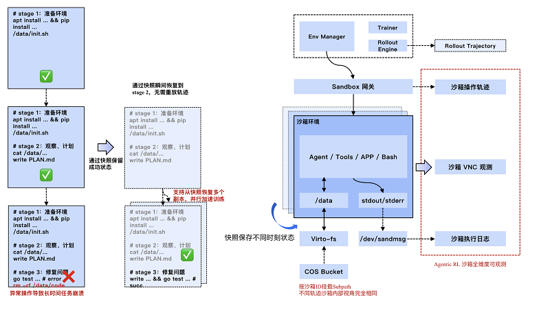 作为腾讯云为AI智能体量身打造的新一代任务执行环境,腾讯云Agent Runtime沙箱具备四大核心优势:一是全链路安全防护,构建环境隔离、权限管控、行为审计的完整安全防线;二是Agent原生资源架构,支持沙箱暂停/恢复/快照能力,实现资源高效调度;三是极致弹性性能,支撑数十万实例秒级并发、毫秒级启动,应对脉冲式业务需求;四是全生态兼容,多方式接入且原生兼容主流行业协议,可与腾讯云HAI、混元大模型、高性能存储、全球算力资源池等全栈产品深度联动,提供从算力、模型到执行环境的端到端解决方案。同时,该沙箱还支持代码、浏览器、移动端、电脑端等全场景交互环境模拟,提供精准轨迹记录、断点快照回放、全链路可观测的实验支持能力,完美匹配Agent RL训练的核心需求。