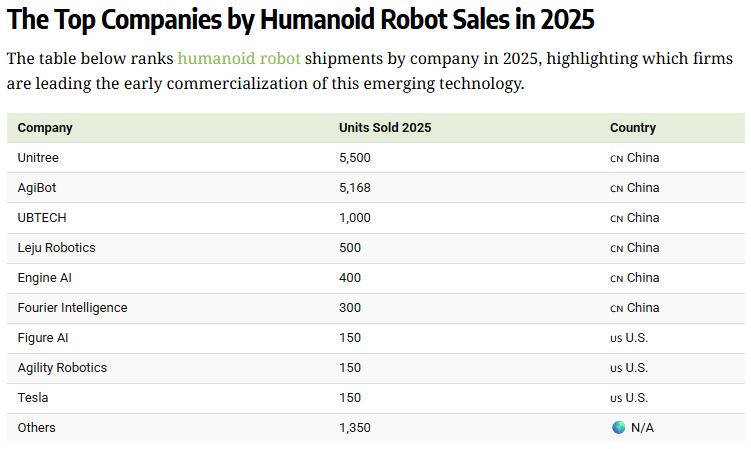 2025年,特斯拉交付了150辆Optimus,预计将于2027年开始公开销售。同样,其他美国领先公司 Figure AI 和 Agility Robotics 的出货量也大致相同。尽管迄今为止交付量有限,Figure AI 的估值仍飙升至 390 亿美元,远高于 2024 年的 26 亿美元。中国凭借完善的供应链体系、核心技术自主化突破及多场景落地优势,稳居全球人形机器人产业第一大国。