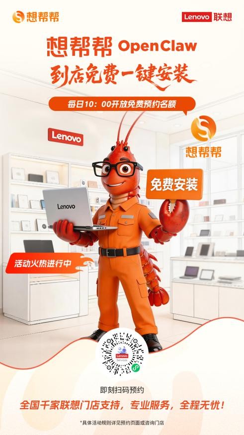 除了线上“零门槛”的一键部署,想帮帮还同步推出了OpenClaw线下免费安装活动。3月16日起,用户可通过“联想服务”小程序一键预约,前往就近的联想门店,享受由专业工程师提供的面对面部署服务。工程师将完成OpenClaw框架的深度部署及基础环境调试,确保系统在用户设备上稳定运行。目前,该活动的预约通道已全面开放,活动期间每天提供1000个免费预约名额,覆盖全国的2000多家联想门店。
