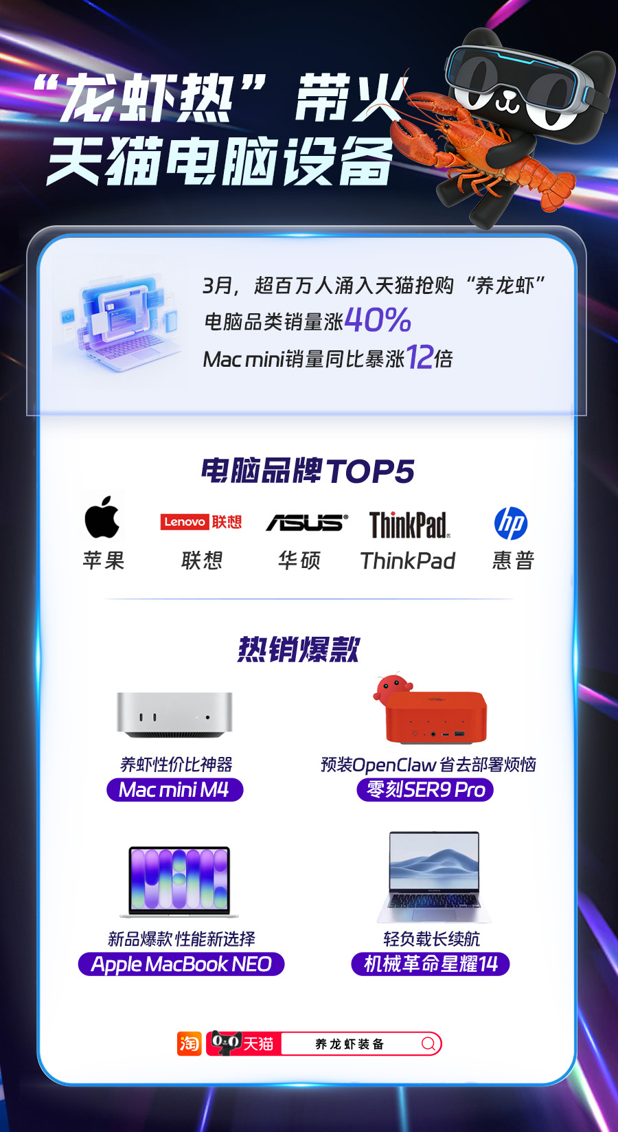 3月至今,已有超100万人涌入天猫抢购“养龙虾”装备,天猫平台上的电脑设备销量整体增长40%,其中苹果、联想、华硕、ThinkPad、惠普成为销量最高的TOP5电脑品牌。