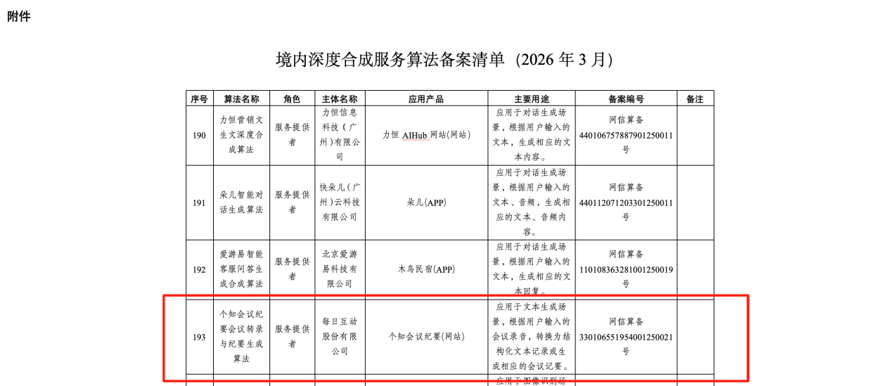 近日,国家互联网信息办公室发布境内深度合成服务算法备案信息公告。每日互动“个知会议纪要会议转录与纪要生成算法”正式通过审核并完成备案。此次备案的通过,标志着每日互动相关技术能力在政务、企业、媒体等核心会议场景中,已获得权威的合规性认可与安全保障,将进一步推动智能化办公场景的规范化发展。