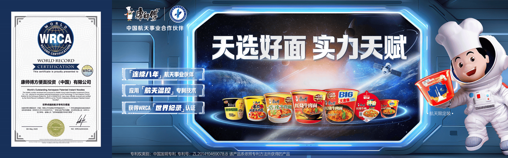 图注:康师傅获得WRCA“世界卓越的航天专利方便面”认证