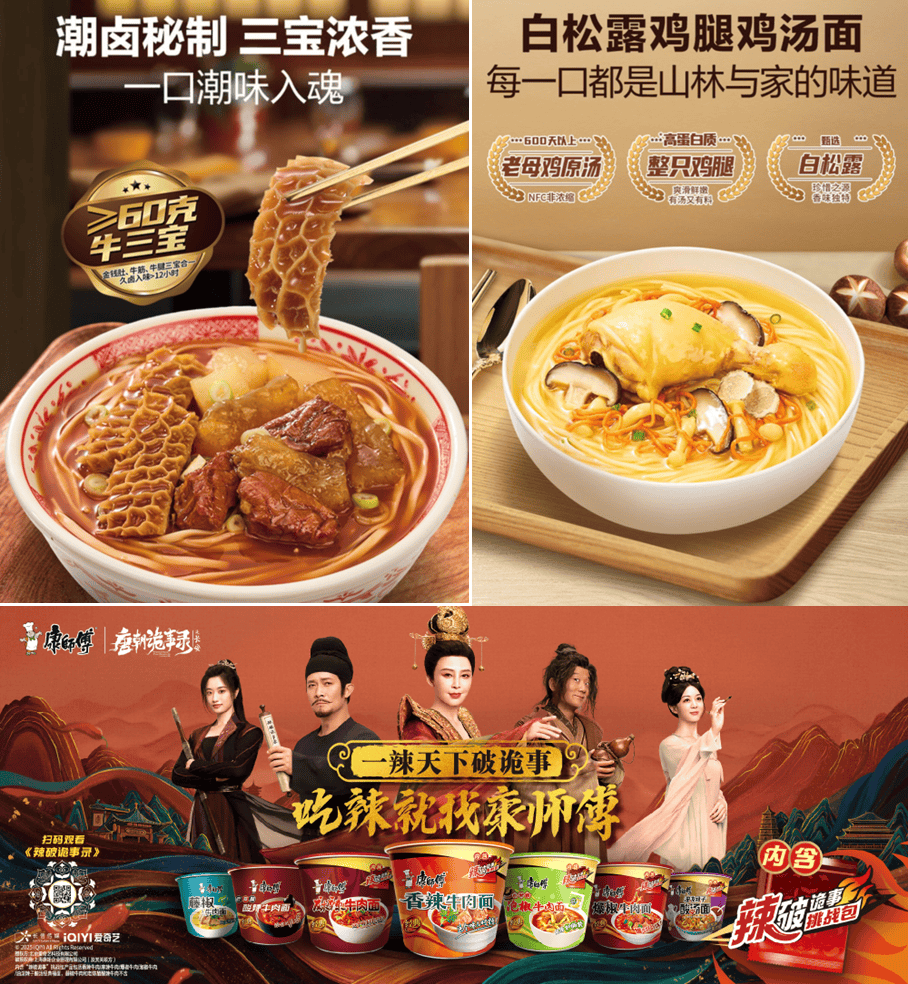 在占领大口味赛道上,康师傅方便面精准洞察年轻群体的味觉偏好与文化共鸣。香辣牛肉面等辣口味巧妙借势高势能影视IP《唐朝诡事录3》,构建起“地道辣”的文化营销矩阵,成功将传统口味转化为年轻人的社交货币,增强年轻客群的口味忠诚度与复购率。