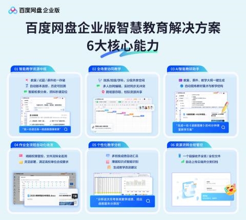 在聚焦“教 、研 、管 、存” 四大环节的基础上, 百度网盘企业版“智慧教育一体化解决方案”进一步落地为“智能教学资源中枢” 、“全场景协同教学” 、“AI智能教研助手 ” 、“作业全流程自动化收发” 、“个性化教学分析”、“资源流转合规管控”六项核心能力 ,将技术赋能转化为可落地的教学管理实效。