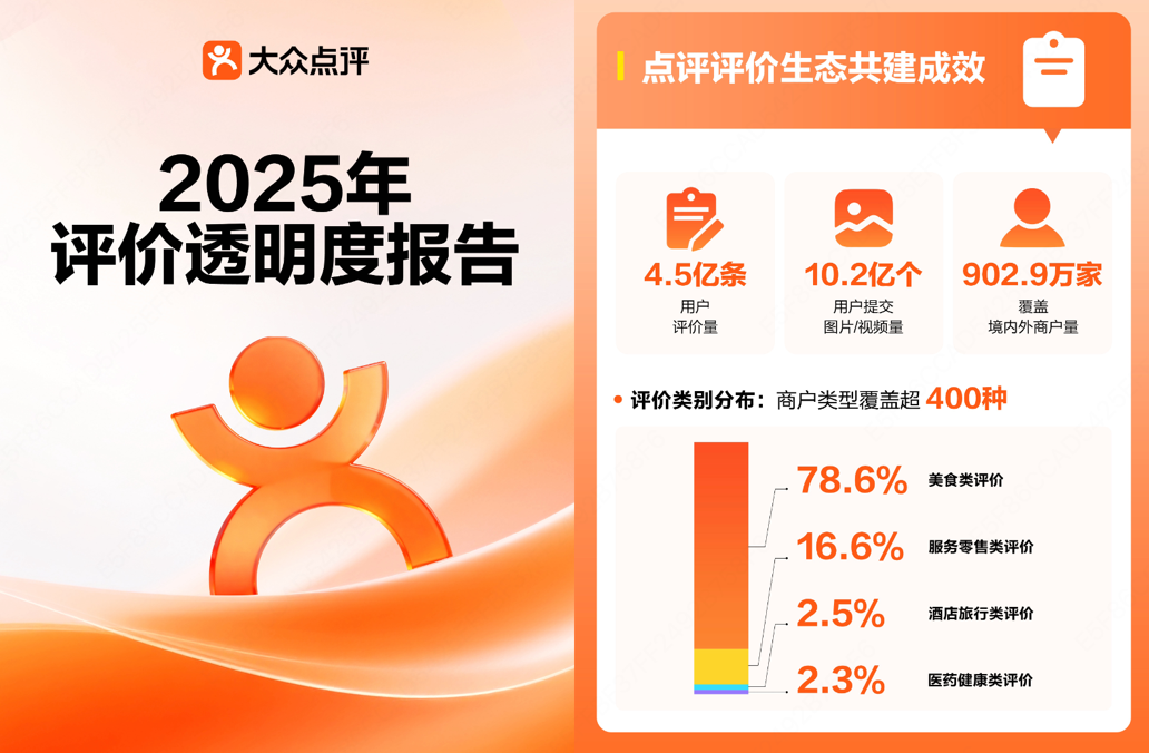 3月23日,大众点评发布《2025年评价透明度报告》。报告显示,过去一年,大众点评App累计收到近4.5亿条用户评价,覆盖境内外近902.9万家商户、超400种商户类型,持续依托海量真实评价与榜单,帮助用户找到、发现并体验真实世界的美好。