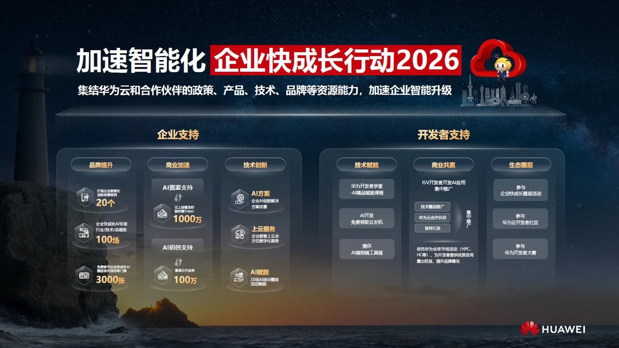 聚焦企业和开发者两大核心群体,“企业快成长行动2026”将整合华为云与伙伴在政策、产品、技术、品牌等方面的优势资源,以精准化、体系化的支持举措,助力企业跨越AI应用门槛,加速智能化升级进程。