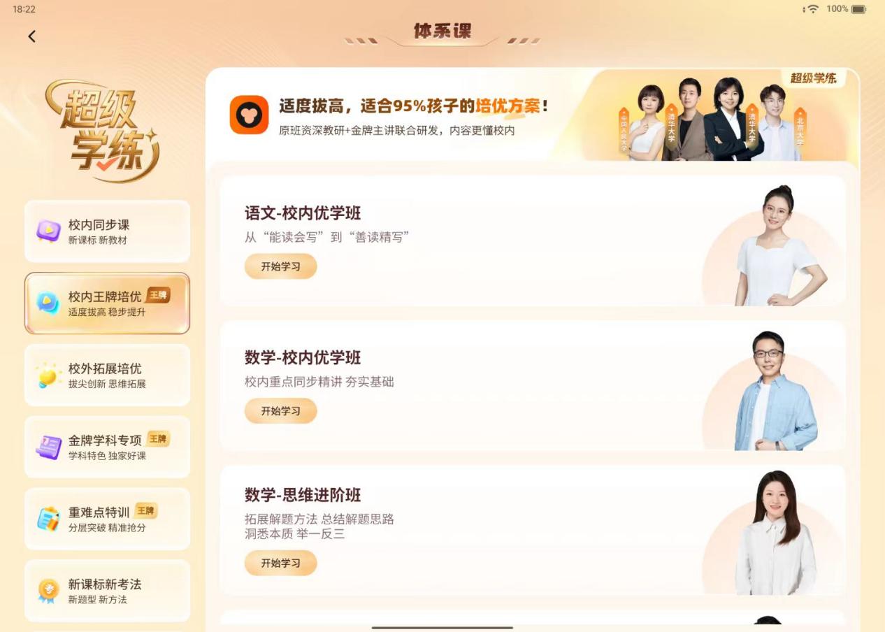 以校内王牌培优课为例,价值30余万元的猿辅导王牌课程免费内置到T6学习机,能够精准匹配90%以上的孩子实现校内适度拔高、稳步提升;独家上线的学科金牌专项课,覆盖5大学科15大核心能力,通过“一科一策”的专项突破,成为孩子快速补齐短板的“偏科救星”。16大课程体系不仅为T6注入了不可复制的结构化内容资产,也是系统为孩子精准推荐学习课程的根基。