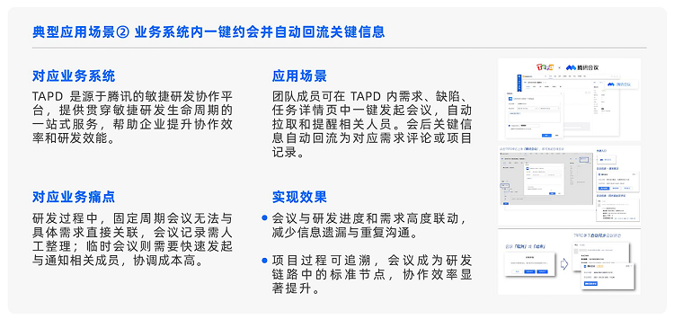 在具体场景落地中,腾讯会议的AI赋能效果尤为显著。在敏捷研发协作平台TAPD中,团队成员可以在需求、缺陷详情页一键发起腾讯会议,系统自动拉人提醒,会中的关键信息实时同步至TAPD,研发进度自动更新,大幅减少信息遗漏和重复沟通,推动研发效率显著提升。