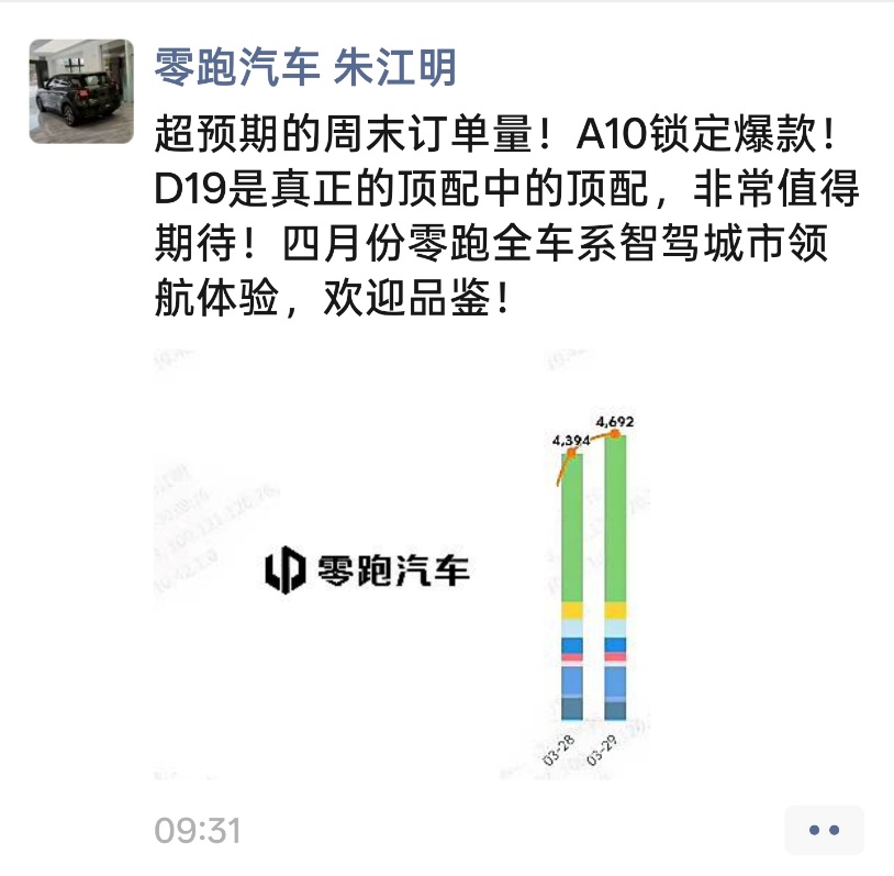 3月30日,零跑汽车创始人、董事长兼CEO朱江明在社交平台发出最新销量战报:超预期的周末订单量!A10锁定爆款!D19是真正顶配中的顶配,非常值得期待!四月份零跑全车系智驾城市领航体验,欢迎品鉴!战报显示,零跑周六大定订单达4394台,周日持续高热,维持在4692台高位,共超9000+台。 在3月底,零跑以强势表现,率先引领电车市场复苏,得益于ABCD全系列的协同爆发,印证了“全域自研”与“好而不贵”品牌主张已深入用户心智。