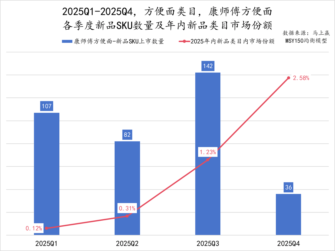 2025年无疑是康师傅的新品大年,各季度均有双位数的新品SKU陆续上市,一季度、三季度新品SKU数量较多,全年共推出新品超300个。但新品数量只是评价标准之一,“推得多”更要“养得活”。