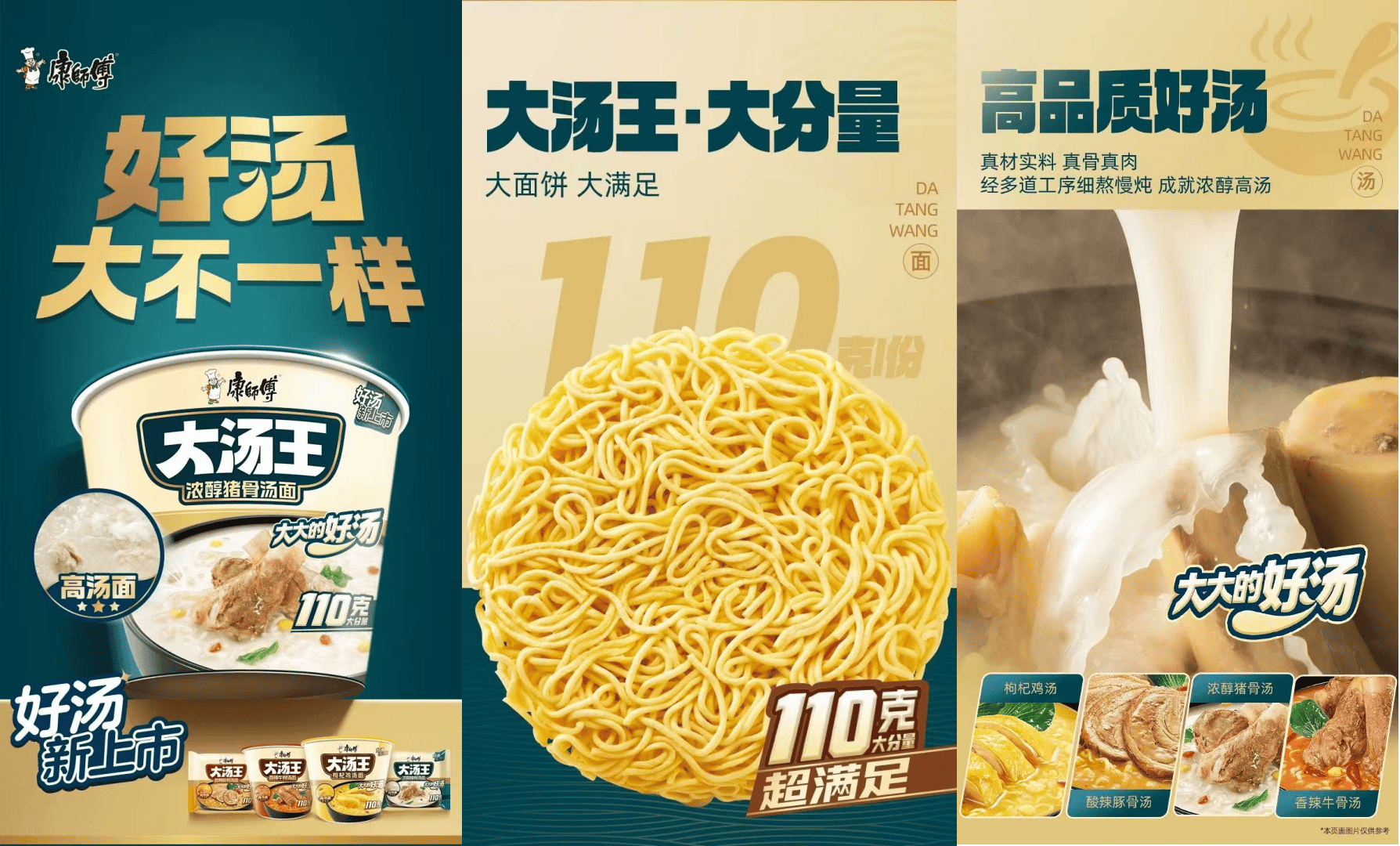 通过渠道能力快速发力的不止火鸡面,还有康师傅大汤王系列产品。作为今年全新推出、主打好汤的产品系列,大汤王自2025年8月上市以来,市场份额及铺市率均成长显著。