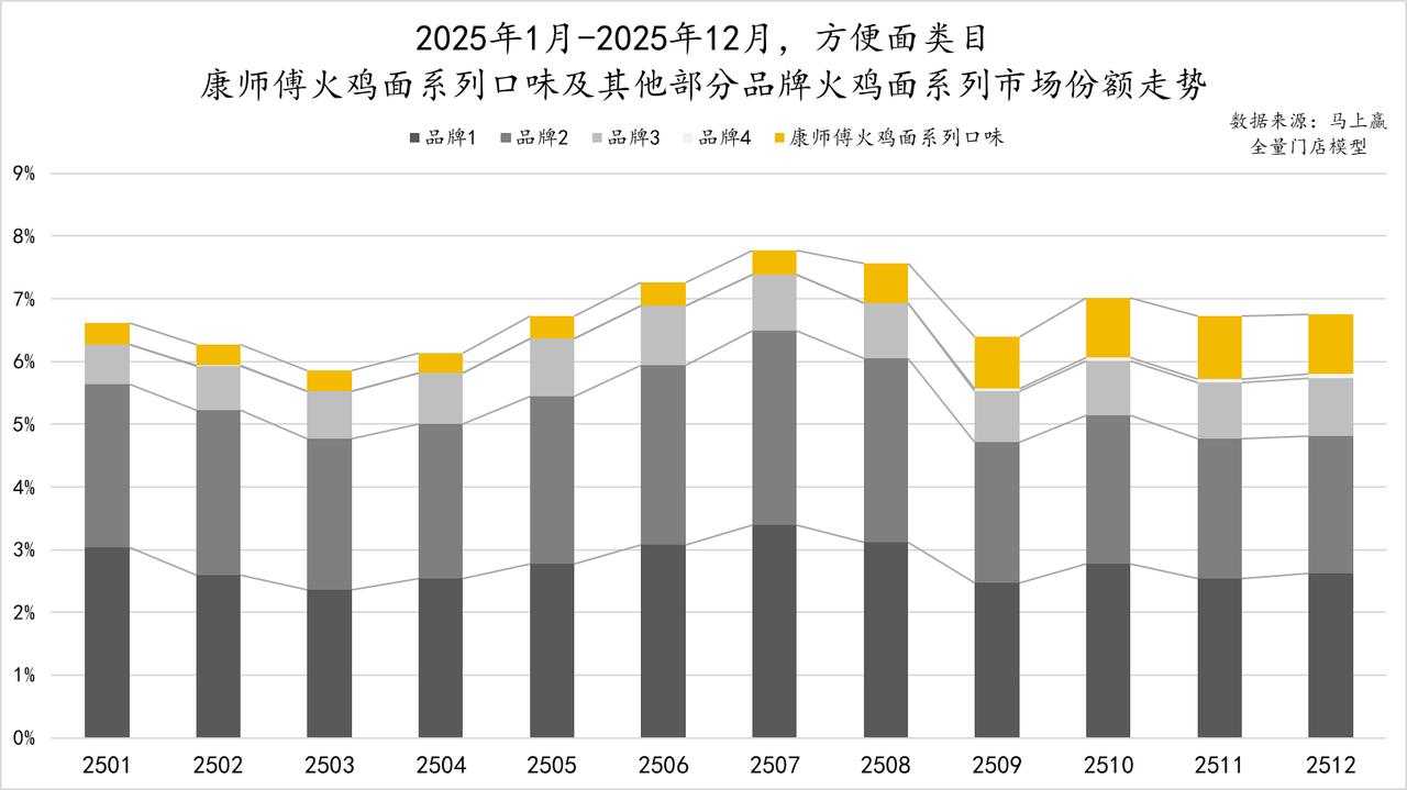 自2025年7月、8月起,康师傅火鸡面系列市场份额出现明显跃升,并在此后保持了增长态势与份额,对其他品牌的火鸡面系列产品形成了明显的挤压。以2025年12月,康师傅的火鸡面系列市场份额对比年初,系列市场份额翻了一倍有余。