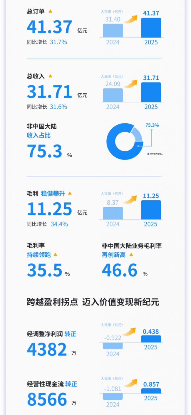 2025年,来自中国大陆以外地区的收入为23.87亿元,占总收入的75.3%,毛利率达46.6%。