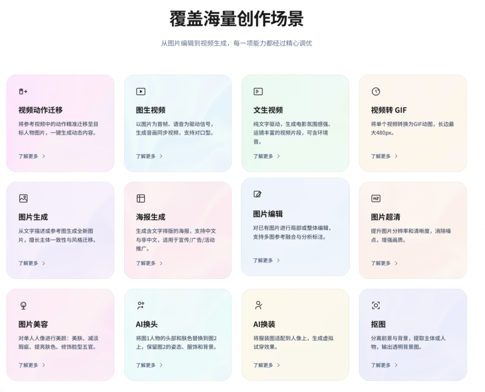 根据公开信息,目前美图AI开放平台已开放8种AI影像能力模块,全面覆盖视频动作迁移、图片编辑、图片生成/设计、图片超清、AI换装、图生视频、智能改尺寸、智能抠图主流视觉创作场景。