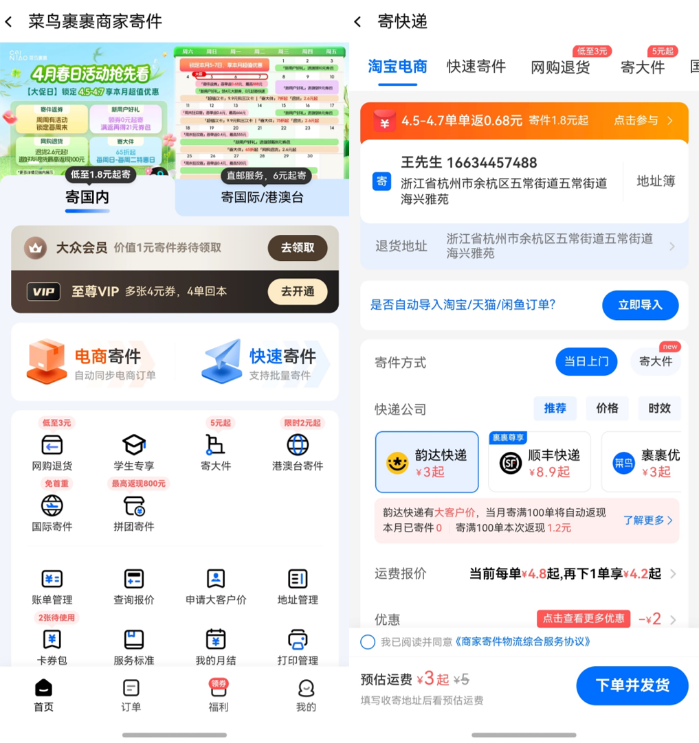 • 发货也是个麻烦事?现在千牛里直接集成了菜鸟裹裹寄件功能,商家不用在手机里来回切换,点几下就能完成下单,等着快递员上门就行,省心又省力。