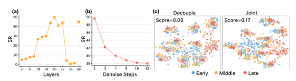 研发团队在消融实验中发现了一个违反常理的结论:从视频模型提取特征时,只需单步去噪效果最好,步数越多、太清晰,性能反而下降。提取层也有讲究,第 18 层(中间偏深层)的特征最优,达到性能峰值。