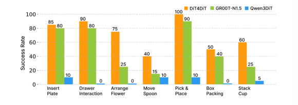 零样本泛化是该方法最突出的能力。换物体材质、换形状、换数量:面对从未见过的测试场景,DiT4DiT 仍保持 40%–70% 的成功率。对比看, Qwen3DiT 在多项泛化测试中直接归零。这一差距说明:视频生成赋予的物理直觉,确实比静态图文对齐更贴近真实世界的复杂性。