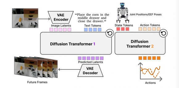 简单讲:一个负责"理解世界会怎么变",一个负责"决定手该怎么动"。视频生成模型花了海量算力学到的物理直觉,被直接注入了机器人的决策系统。