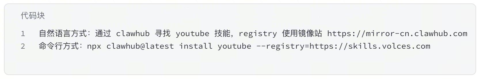 输入:“通过 clawhub 寻找 youtube 技能,registry 使用镜像站 https://mirror-cn.clawhub.com”,即可快速接入“ClawHub镜像站”、下载并使用相应的skill。其他任务只需要按照上述提示词模板,替换相应的skill名称。