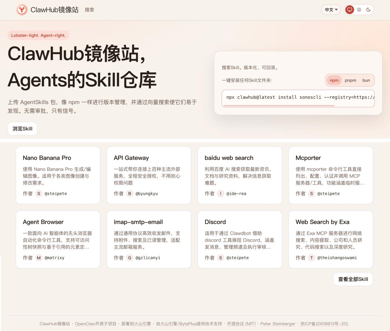 图注:点击http://mirror-cn.clawhub.com/ 以直接跳转到该镜像站,官网显示由火山引擎提供支持。